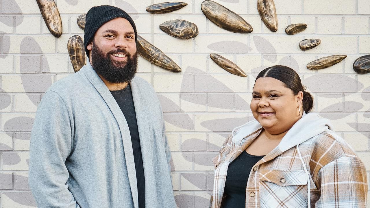 Artists Carmen Glynn-Braun, a Kaytetye/Anmatyerre woman, and Kamilaroi man Dennis Golding are the creatives behind an artwork on the exterior walls of the South Sydney Rabbitohs' new home ground in Sydney's eastern suburbs.