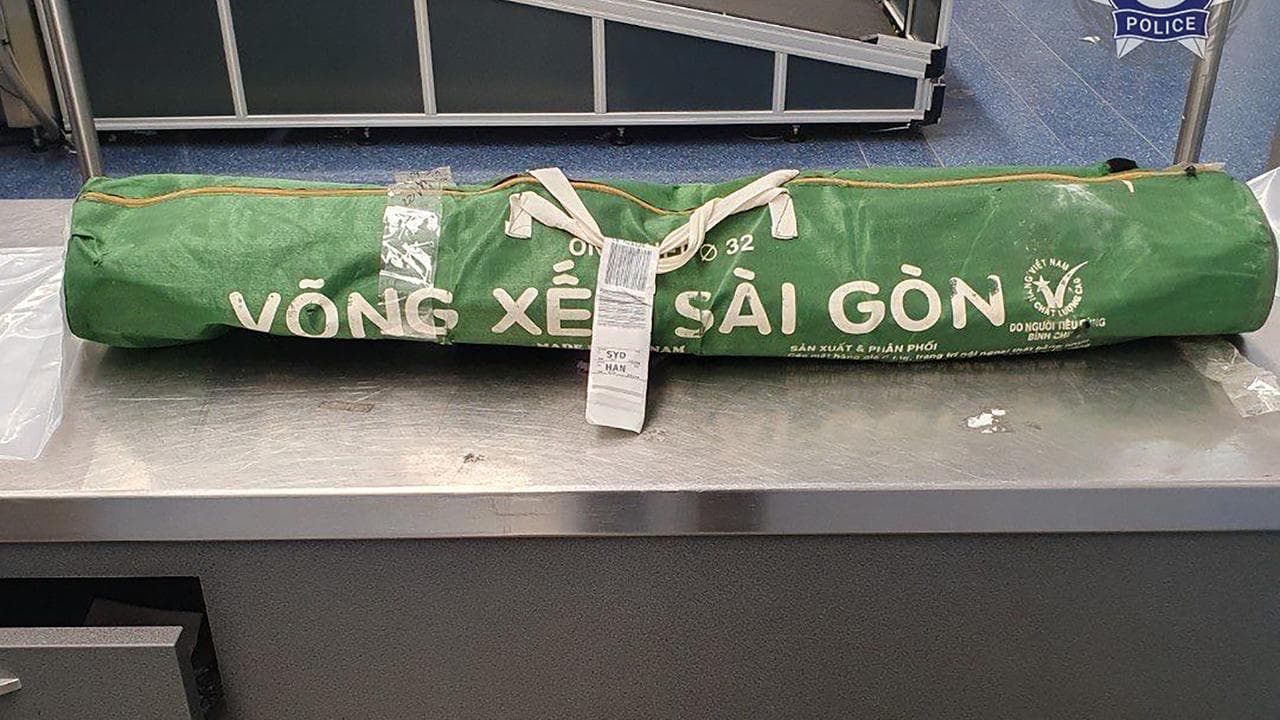 Australian Border Force officers allegedly found 5kg of heroin, worth $2.25 million, concealed in his camp stretcher.
