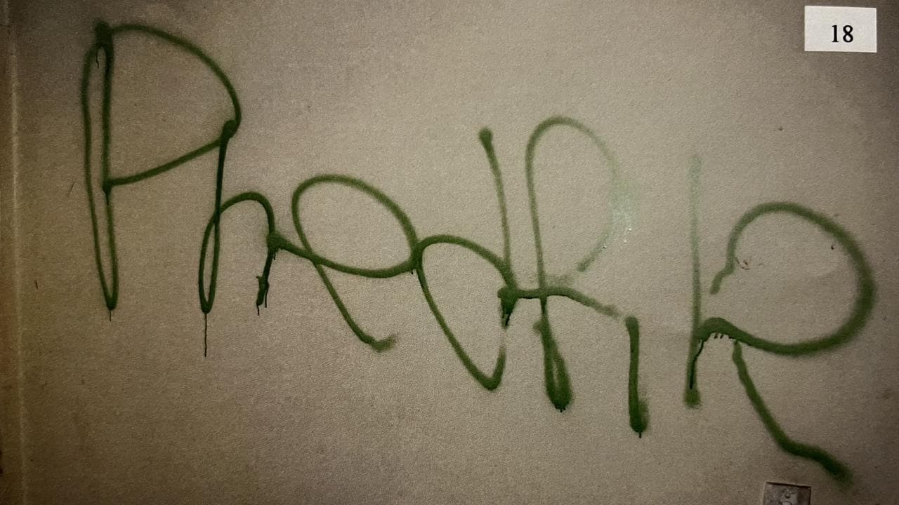 The word “Phedfile” was spraypainted on a wall.