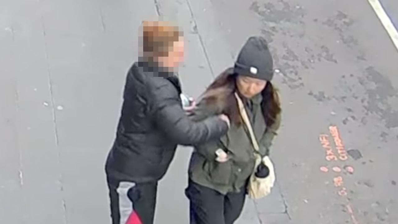 The 32-year-old alleged offender, wearing all black, then runs off while Ms Lai crouches over as a bystander comes up to help.