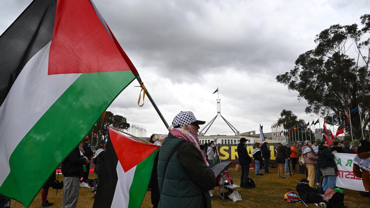 Opposite Parliament House, a bright yellow banner urged those inside to "sanction Israel now" as hundreds gathered around.