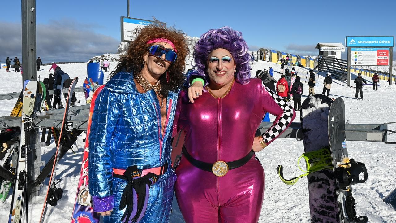 Drag queen Frock Hudson and drag king Freddie Merkin were also lapping up the conditions while shooting promotion for September's Gay Ski Week.