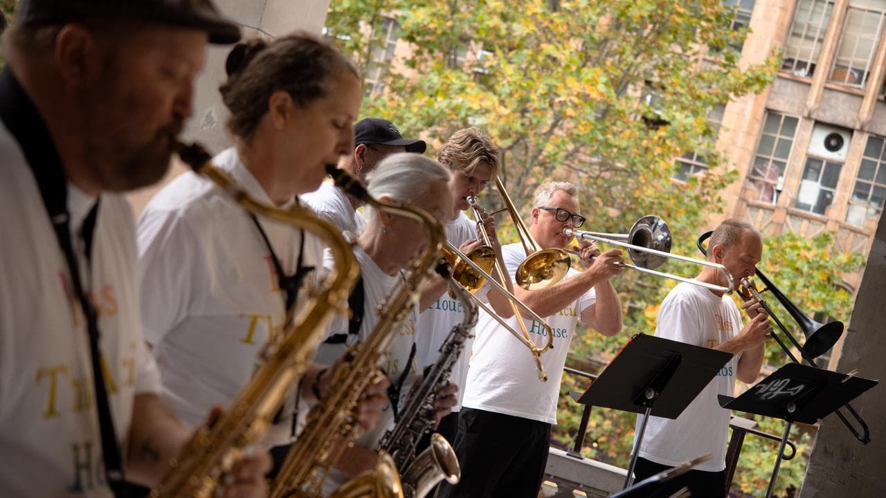 Deller has been collaborating on '80s dance anthems with community brass bands across Victoria, and Merri-Bek City Band gave a brief performance of big-band-acid-house on the Melbourne Town Hall balcony.