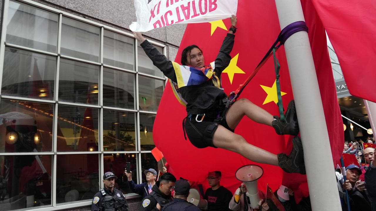 Meanwhile, a demonstrator draped in a Free Tibet flag climbed a flagpole in front of the hotel where Chinese President Xi Jinping was due to meet with US CEOs on Wednesday evening, capping a day of demonstrations against, and for, the Chinese leader.
