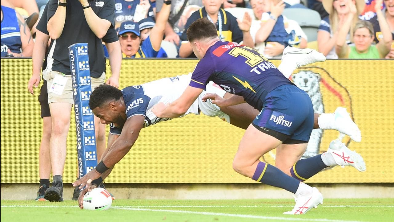 The Cowboys soon hit back when Melbourne coughed up the ball inside their own half, with Tom Dearden finding fullback Drinkwater, who sneaked a ball out to Holmes for their third.
