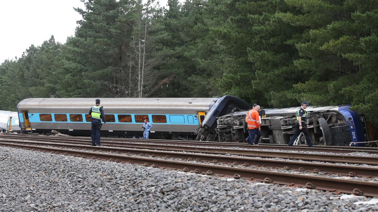 It was travelling between 120 and 130km/h when emergency brakes were applied and the lead car rolled onto its left side and all five carriages derailed, about 8pm.