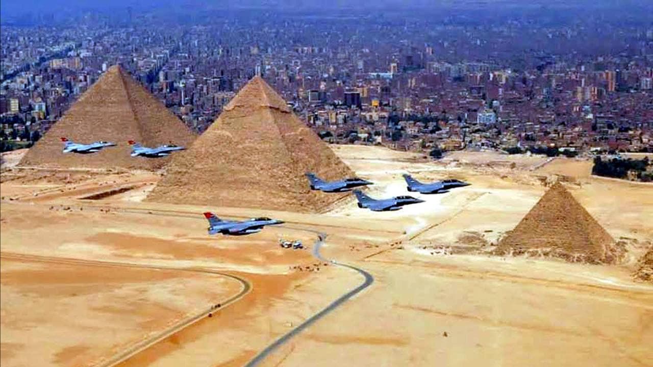 The first clip shows the Egyptian Air Force taking part in an air display over Cairo to mark the graduation of military personnel from the country’s military academies and the 50th anniversary of the October War.