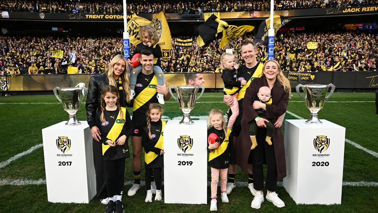 Some late possessions to Cotchin and a signature high-flying Riewoldt mark in the final term drew raucous applause from the Tiger army, who stayed long after the final siren as the departing greats completed a lap of honour.