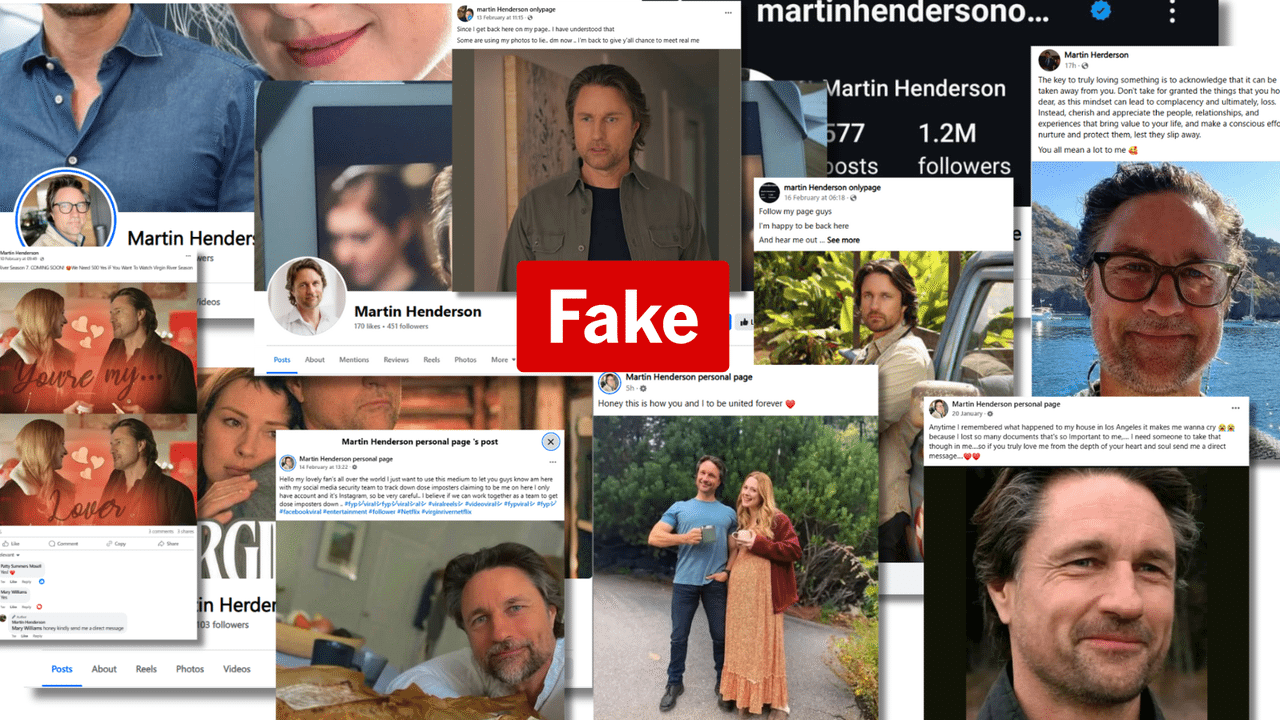 A search for "Martin Henderson" returns hundreds of fake profiles on Facebook alone, which use images from his official Instagram account as well as publicity shots for his Netflix hit Virgin River.