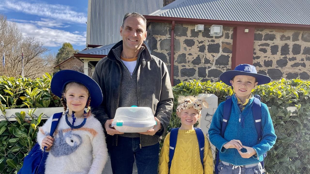 In the photo, taken hours before his arrest in a regional town's supermarket car park, the father of six stands with his kids Hazel, Ginger and Jack, a cake in hand, as they prepare to go to the school fete.