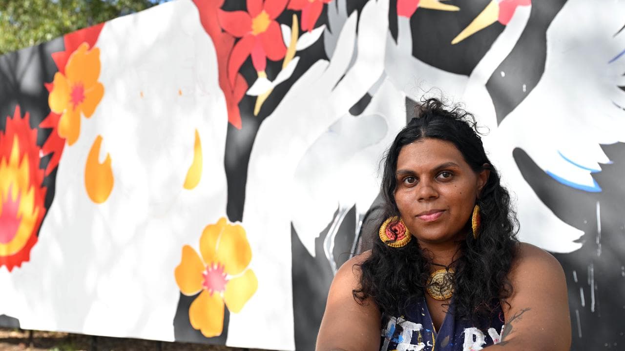 The Balanggarra and Yolngu woman is painting a mural representing the elements of "Fire, Strength and Renewal".
