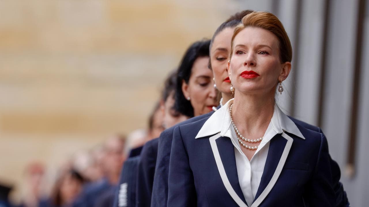 Dozens of women, including artist and lounge curator Kirsha Kaechele, the wife of gallery owner David Walsh, walked in synchronisation to the court.