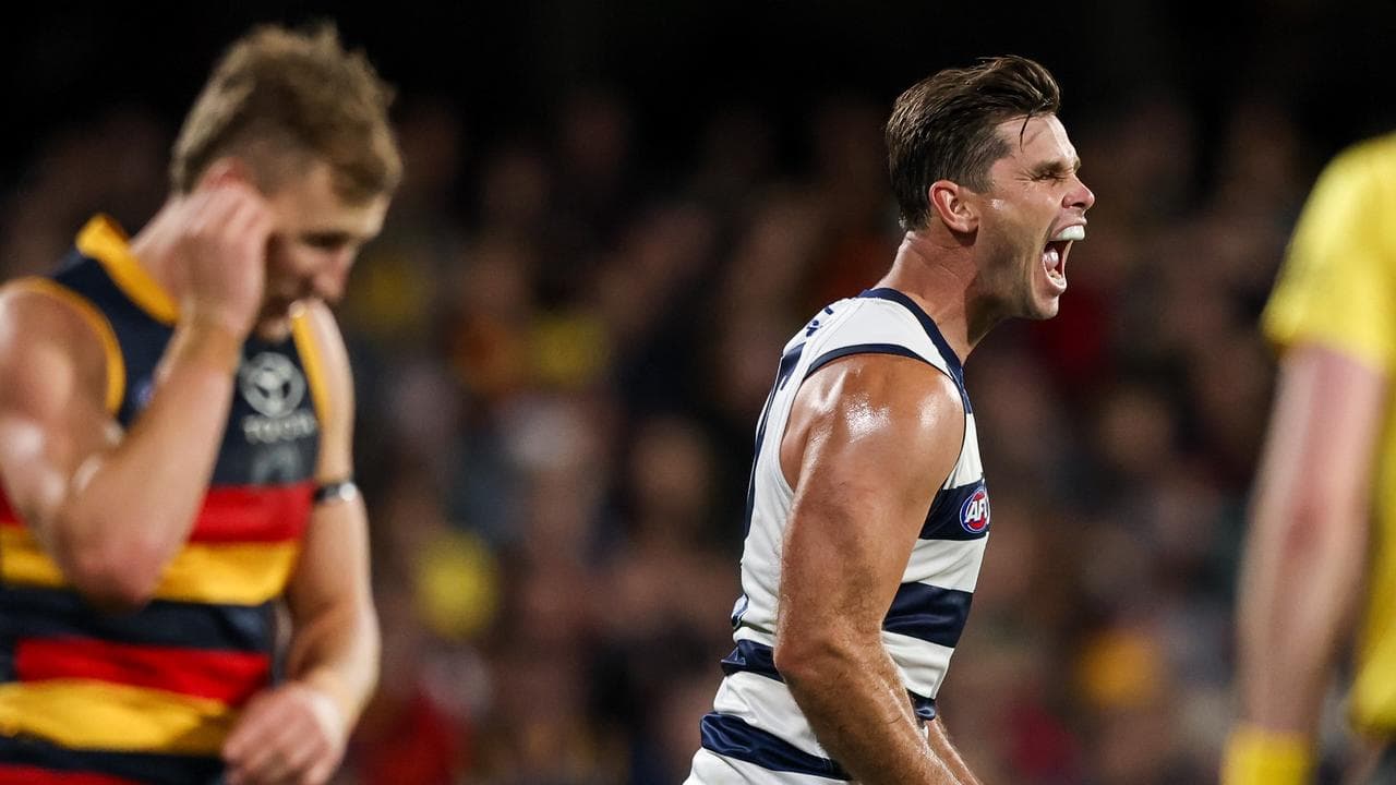 Geelong's attacking ace Tom Hawkins has kicked four goals and produced a game-busting burst in a spirited 19-point away win over Adelaide.