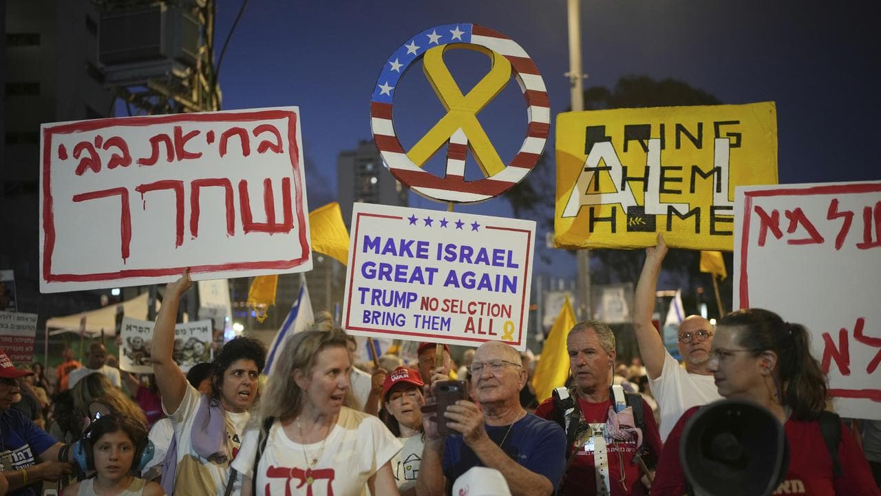 On Saturday evening, crowds gathered at a public square in Tel Aviv near the defence ministry headquarters to call for a ceasefire deal and the return of about 50 hostages still held in the Gaza Strip.