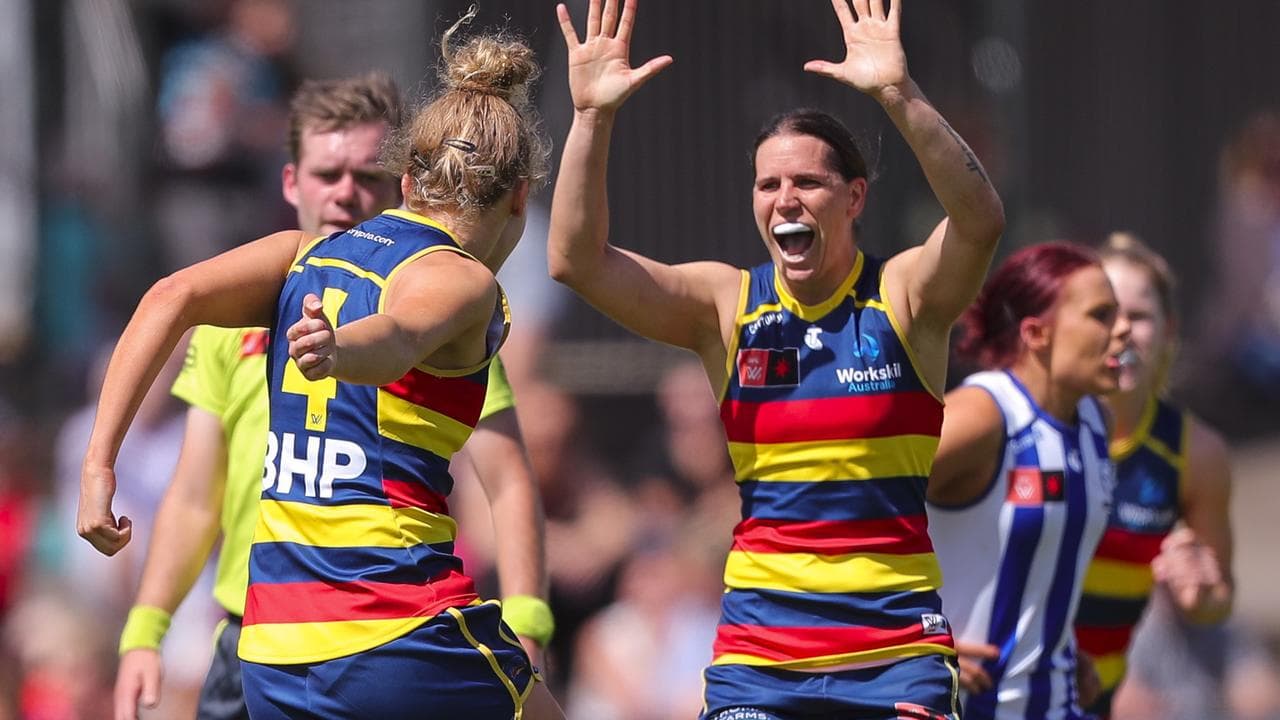 Niamh Kelly has kicked a clutch late goal to lift Adelaide to a thrilling three-point AFLW win over North Melbourne, locking in a top-two finish for the Crows.