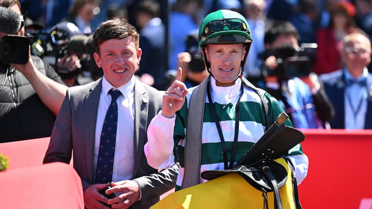 The double Melbourne Cup-winning rider triumphed despite losing the whip in the closing stages.