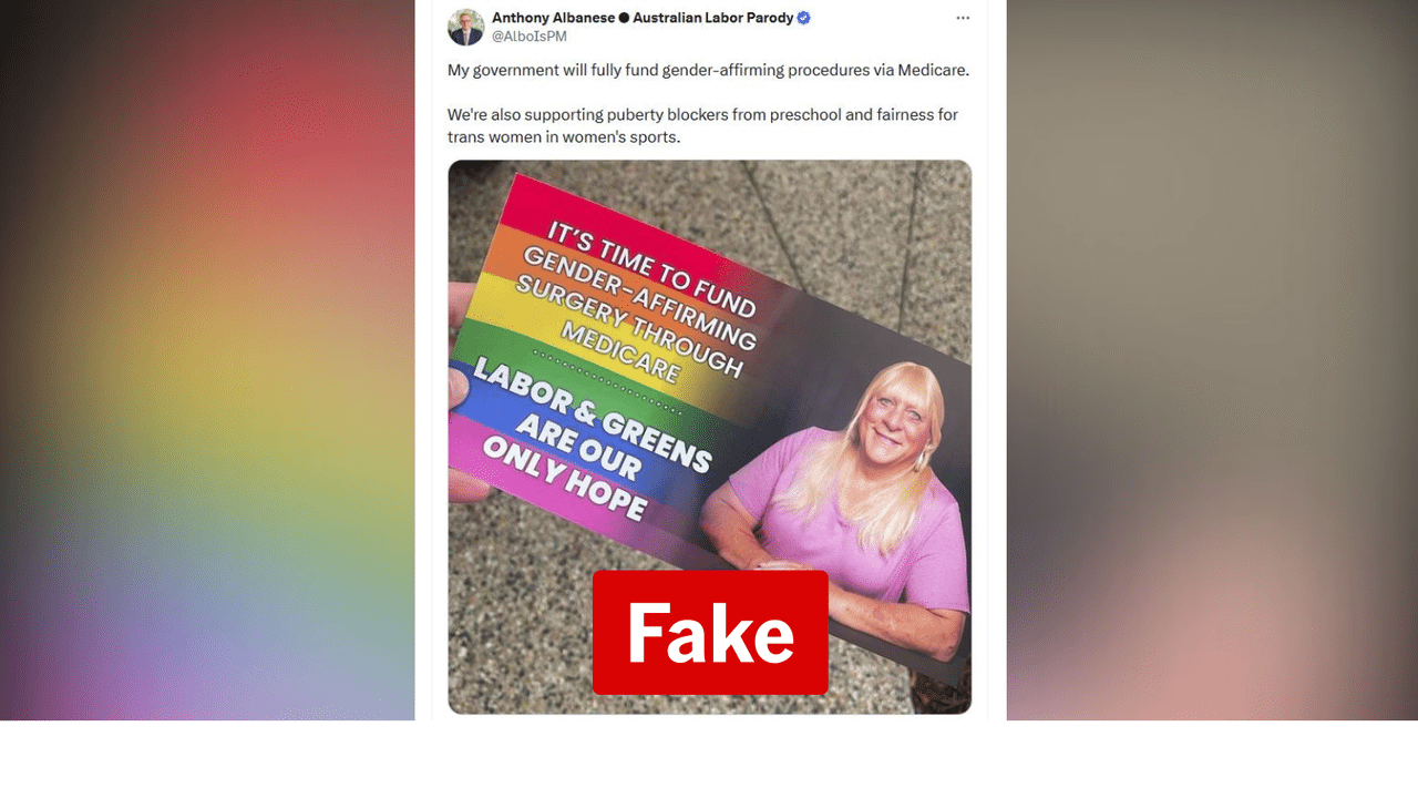 The pamphlet in the post is not authorised by a political party or group, as required by legislation, and has a photo of a person who has regularly popped up as a stock image transgender model. The X account in the post, @AlboisPM, labels itself as "Australian Labor Parody".