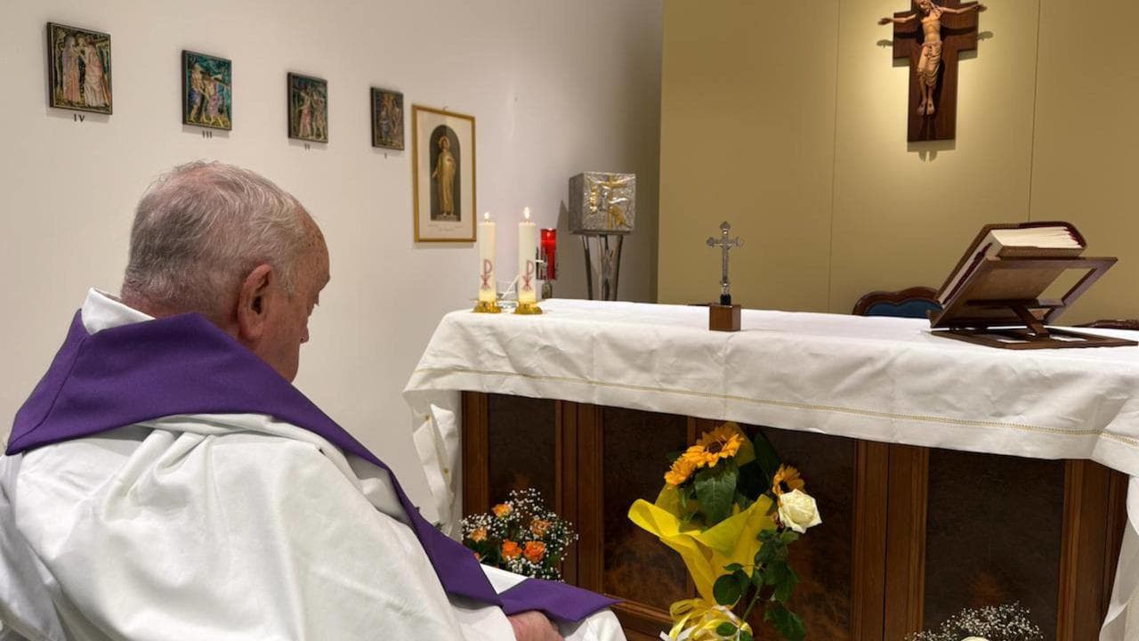 Francis is pictured from behind, sitting facing the altar in a chapel at the hospital. The side of his face is visible and his right hand rests on his lap. There is no sign that he is receiving the supplementary oxygen that he has been given throughout his stay.