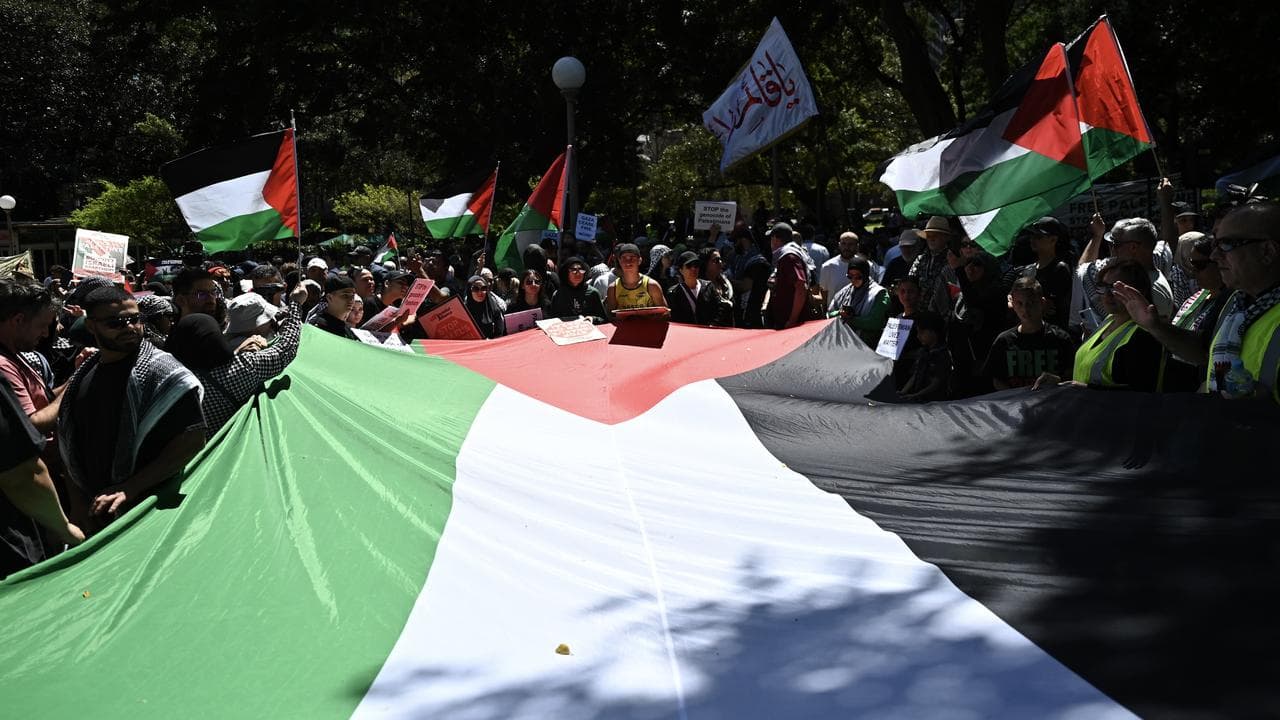 In Melbourne, 10,000 people holding Palestine flags and signs converged outside the State Library of Victoria and surrounding streets for a rally.