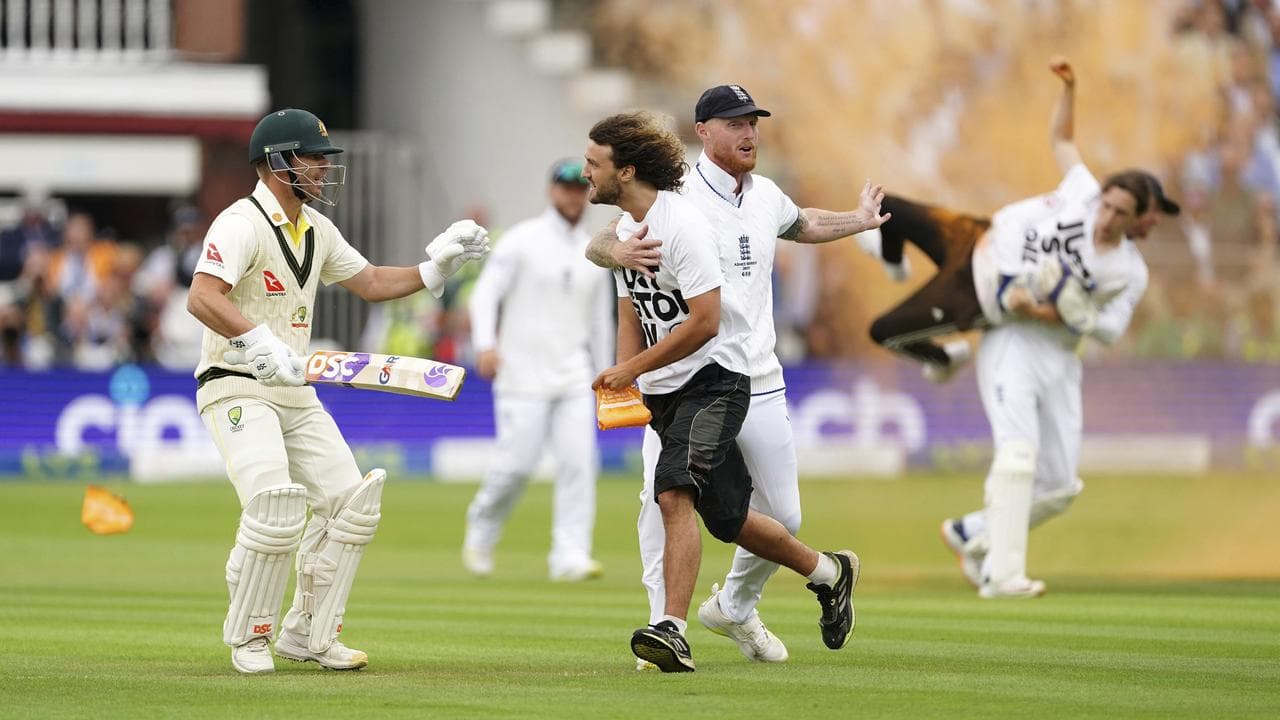 Two Just Stop Oil demonstrators burst on to the ground five minutes after the start of play at the home of cricket on Wednesday, forcing players to physically stop them from throwing orange paint powder on the pitch.