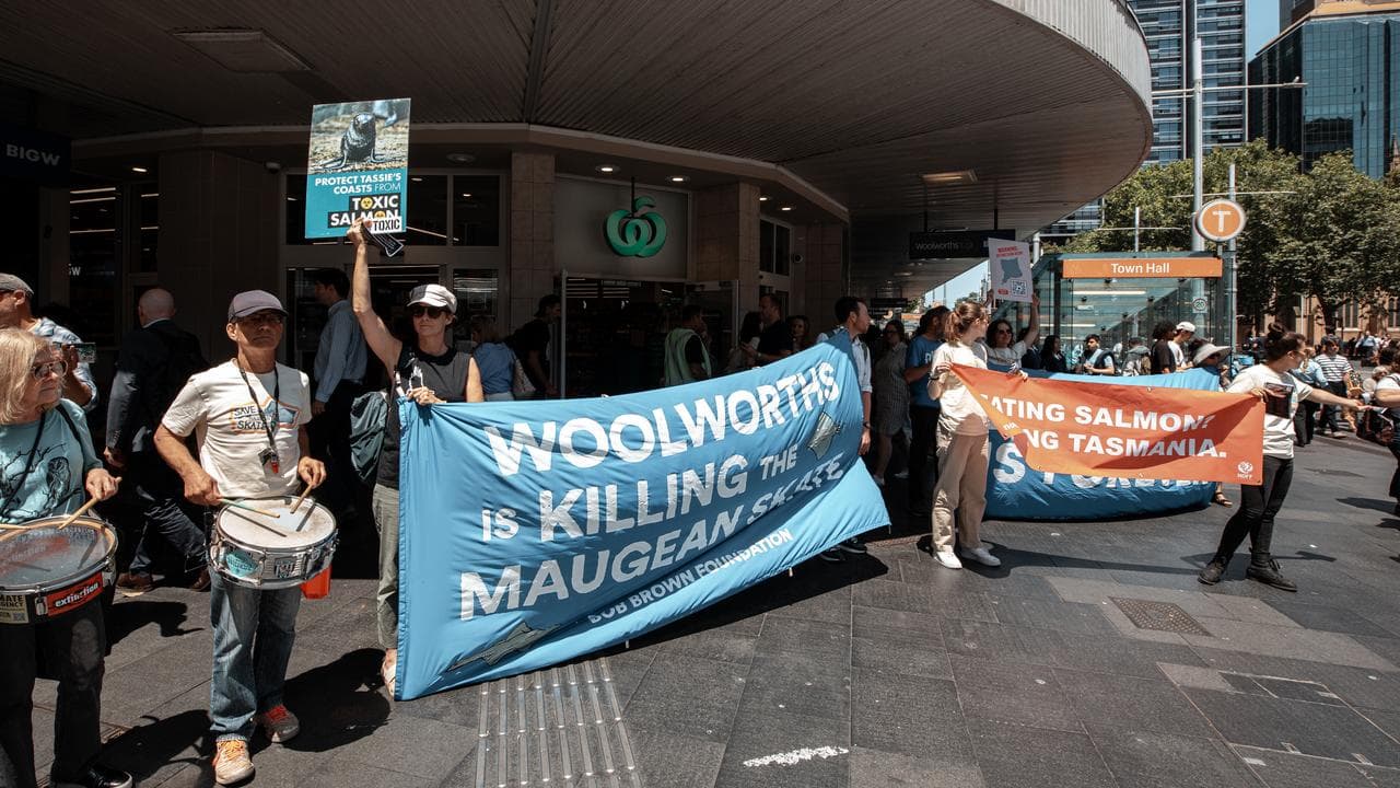 A handful of protesters outside the company's annual general meeting in Sydney on Thursday held signs accusing Woolworths of killing the Maugean skate, a prehistoric ray estimated to number between 40 to 120 individuals in the wild.