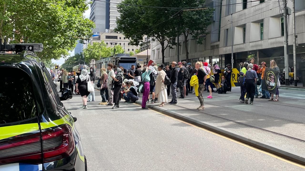 Protesters blocked William Street outside the Melbourne Magistrates Court as the hearing took place, with trams banking up and traffic diverted.