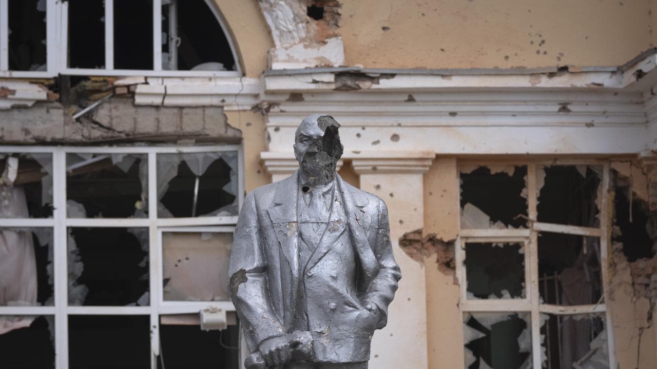 Artillery fire had blown chunks out of a statue of Soviet founder Vladimir Lenin in the town’s central square, while the bright yellow facade of a local administration building was scorched and pockmarked with bullet holes.