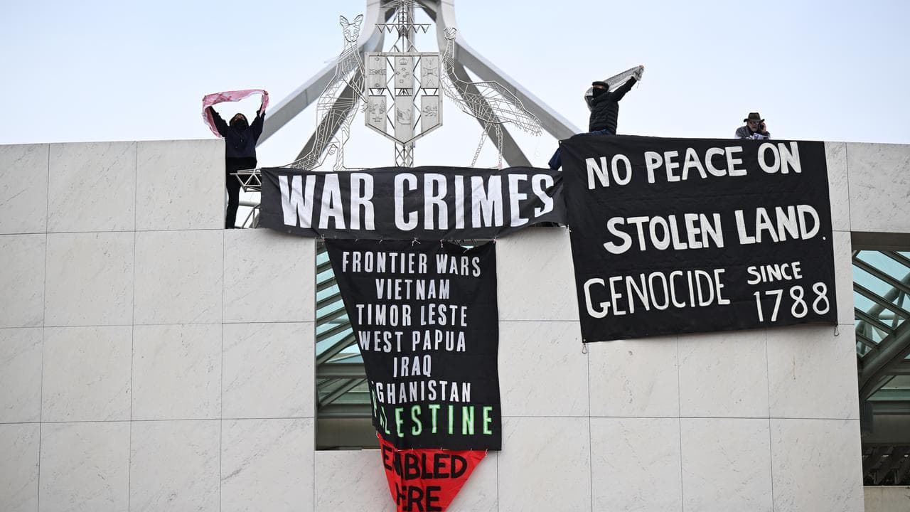 Police arrested four people - three men and one woman - who hung banners from the roof of Parliament House that accused Australia of complicity in "war crimes" and "genocide".