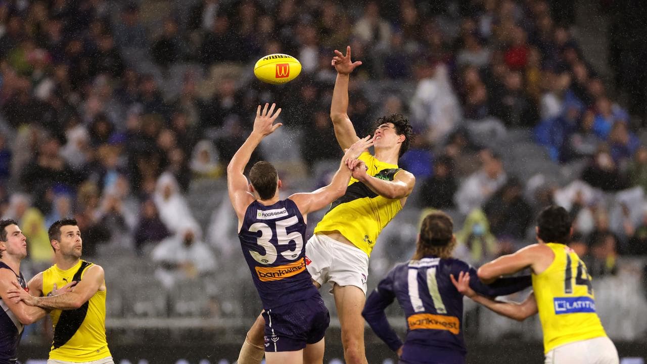 Richmond forward Rhyan Mansell could be in strife for a huge bump on James Aish that rattled the Fremantle winger and even knocked his headband off.