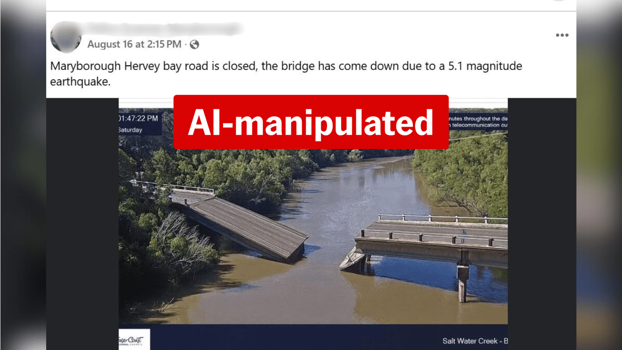 A flood webcam monitoring the bridge proves otherwise, however, as well as the local council and a state government agency confirming the bridge is still standing and the image is a fake, generated by artificial intelligence (AI).