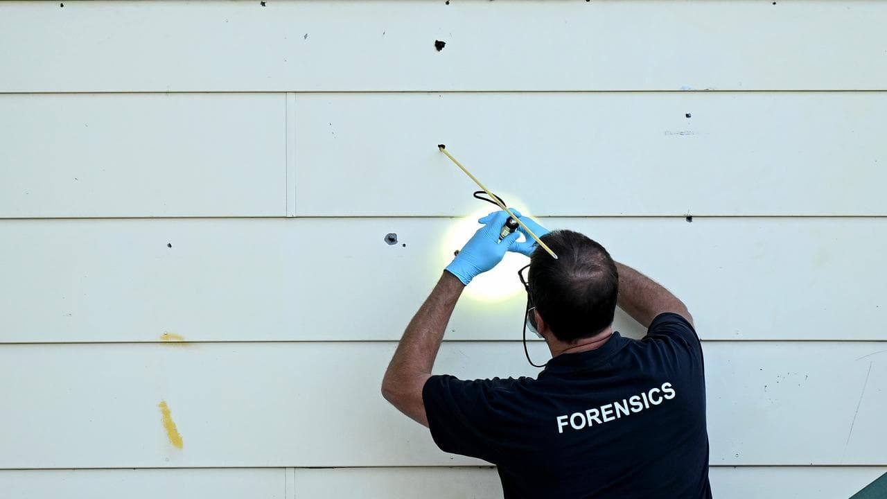 At least three bullet holes could be seen on the house, while around 10 yellow evidence markers were spotted at the taped-off road as police hunt for the killer.