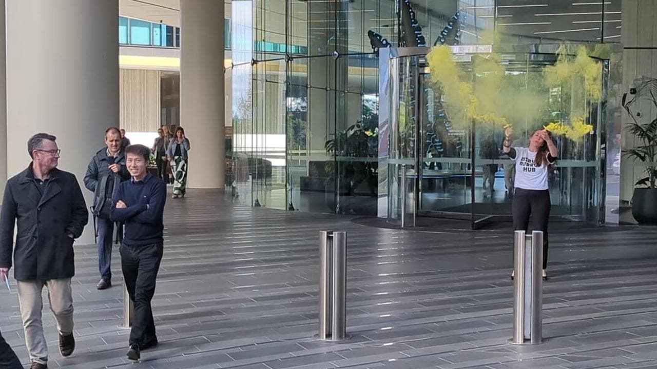 Disrupt Burrup Hub campaigner Kristen Morrissey was photographed holding yellow smoke flares outside the entrance to the oil and gas giant's building.