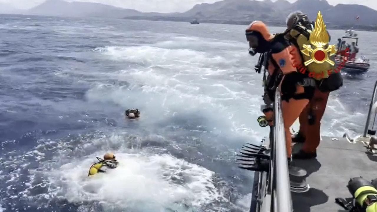 Police divers have resumed searching for six people believed trapped in the hull of a superyacht that sank in a storm off Sicily, including a British tech magnate recently acquitted of fraud charges, his lawyer and a key defence witness at trial.