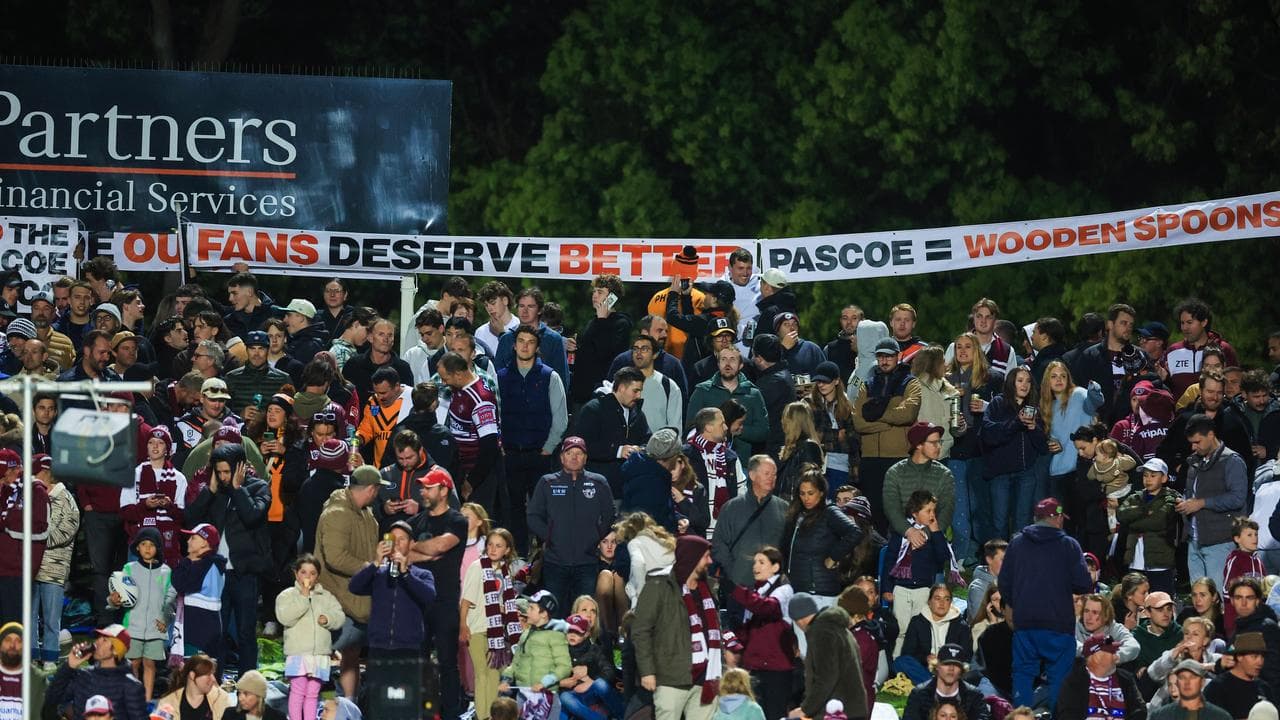 Angry Wests Tigers fans have staged a protest on the Brookvale hill and had banners taken down by security as the joint-venture slumped to a second straight wooden spoon with a 54-12 flogging from Manly.