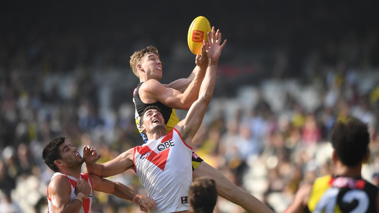 Richmond hard nut Liam Baker faces an anxious wait after collecting Swans defender Lewis Melican with a high bump in the second quarter.