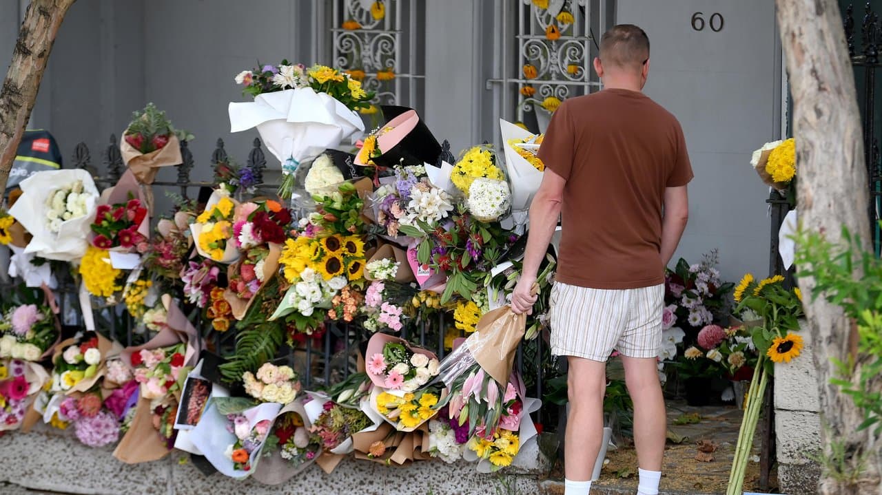 Floral tributes are stacked high outside an inner Sydney home where two young men were slain, as police investigate their murders, allegedly committed by one of their own.