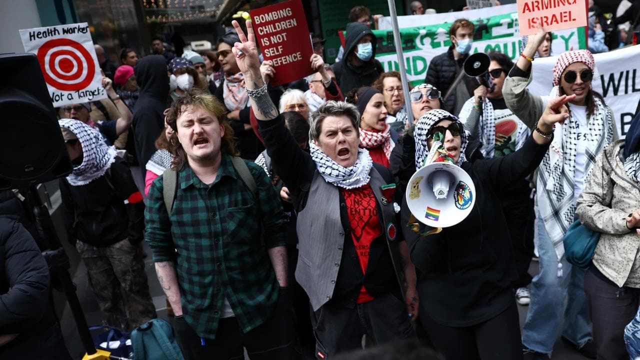 City workers faced disruptions to their commutes home after hundreds of protesters picketed outside the offices of defence contractors Hanwha Defence and Elbit Systems blocking access to cars and trams along Bourke Street.