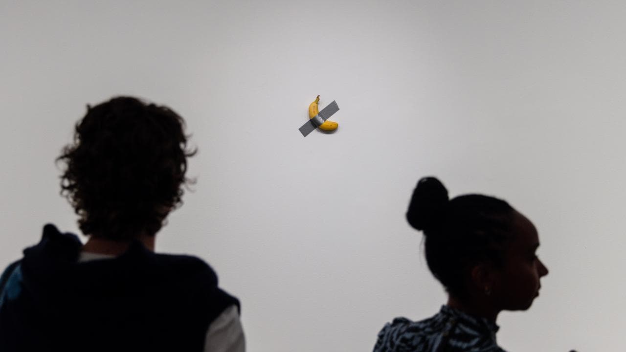 A fresh banana taped to a blank white wall by Maurizio Cattelan and AI-enabled dogs trained by Agnieszka Pilat are expected to draw in crowds, while a giant work from Yoko Ono is visible to anyone walking or catching a tram down St Kilda Road.
